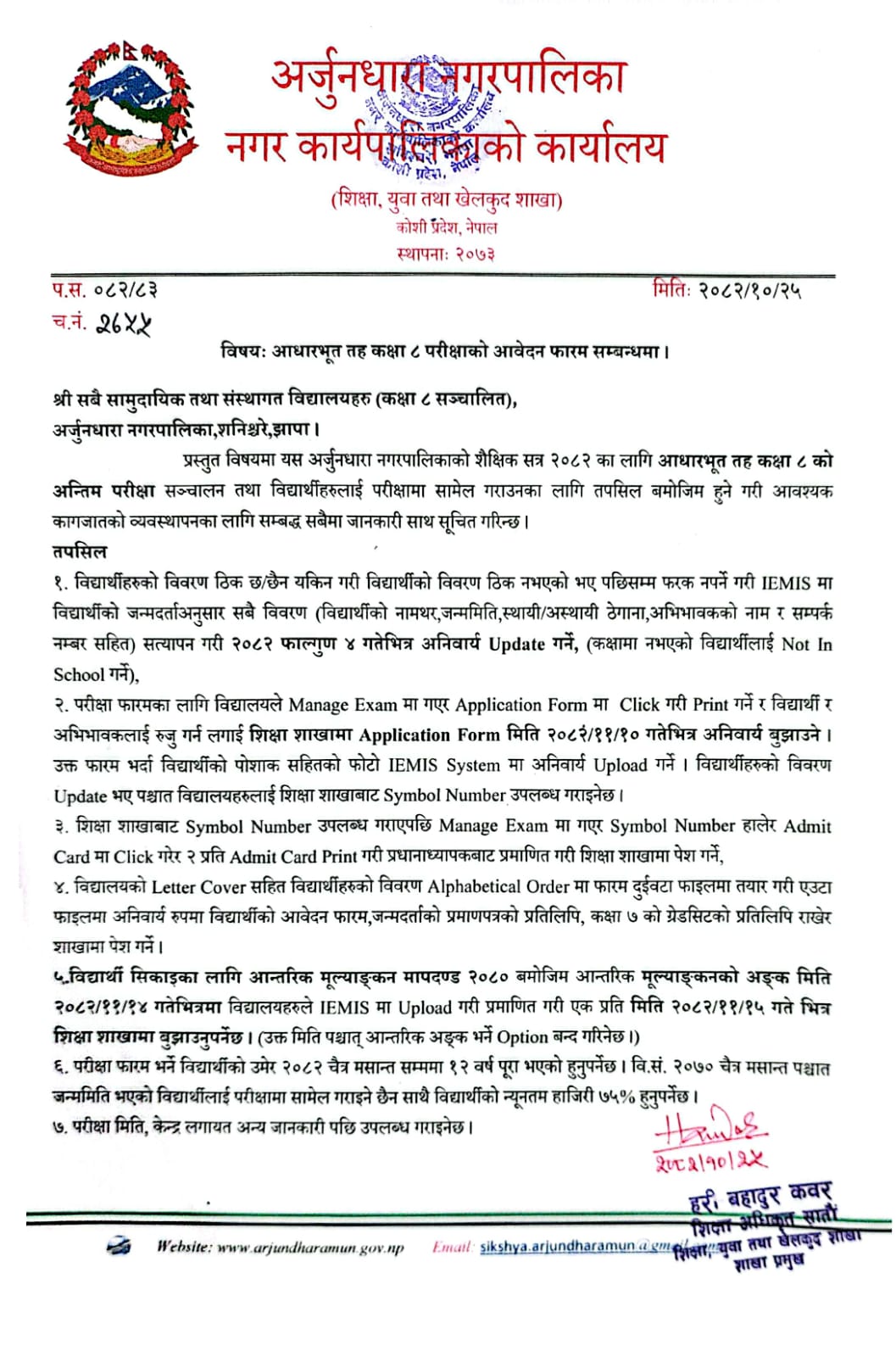 आधारभूत तह कक्षा ८ परीक्षाको आवेदन फारम सम्बन्धमा ।