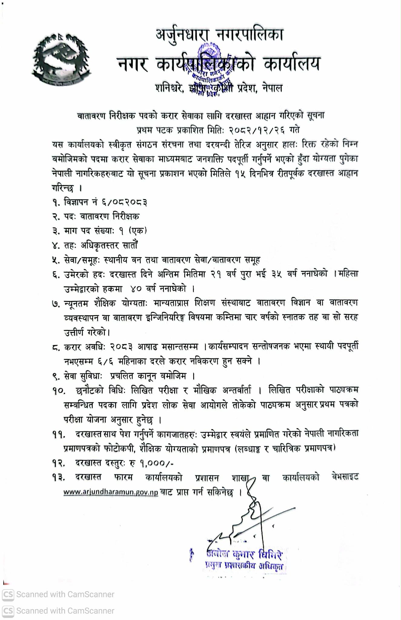 वातावरण निरीक्षक पदको सेवा करारका लागि दरखास्त आह्वान गरिएको सूचना